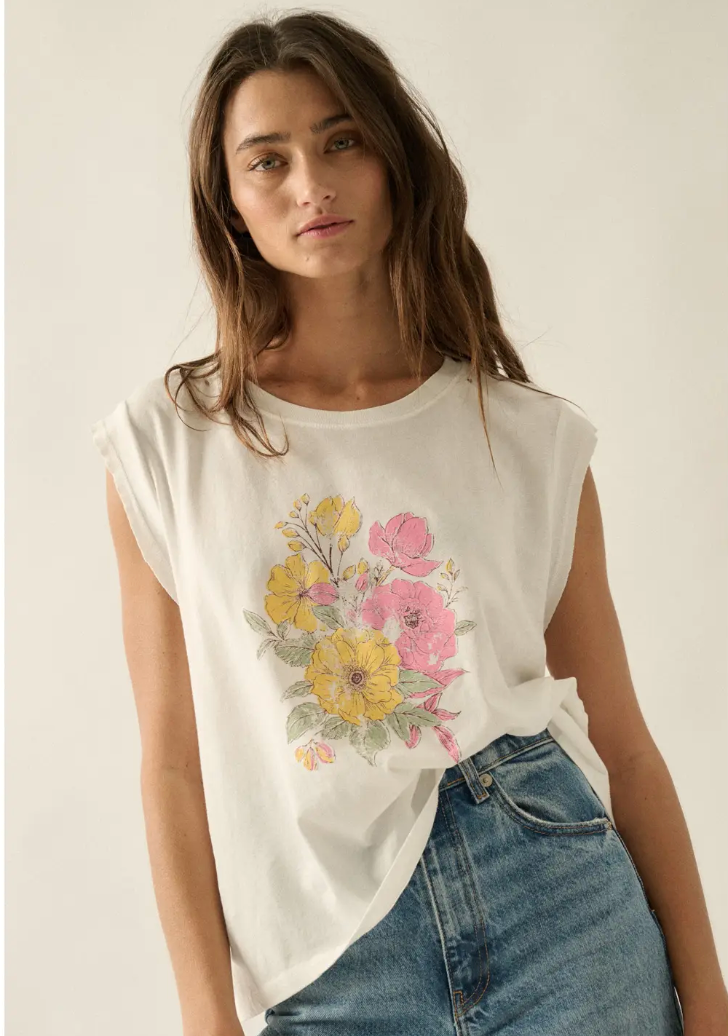 A distressed, garment washed graphic t-shirt with the following features: Torn and distressed detailing at neckline and shoulder seams. Vintage-style floral graphic print. Cutoff sleeves with unfinished raw edge. Round neckline. Relaxed fit.