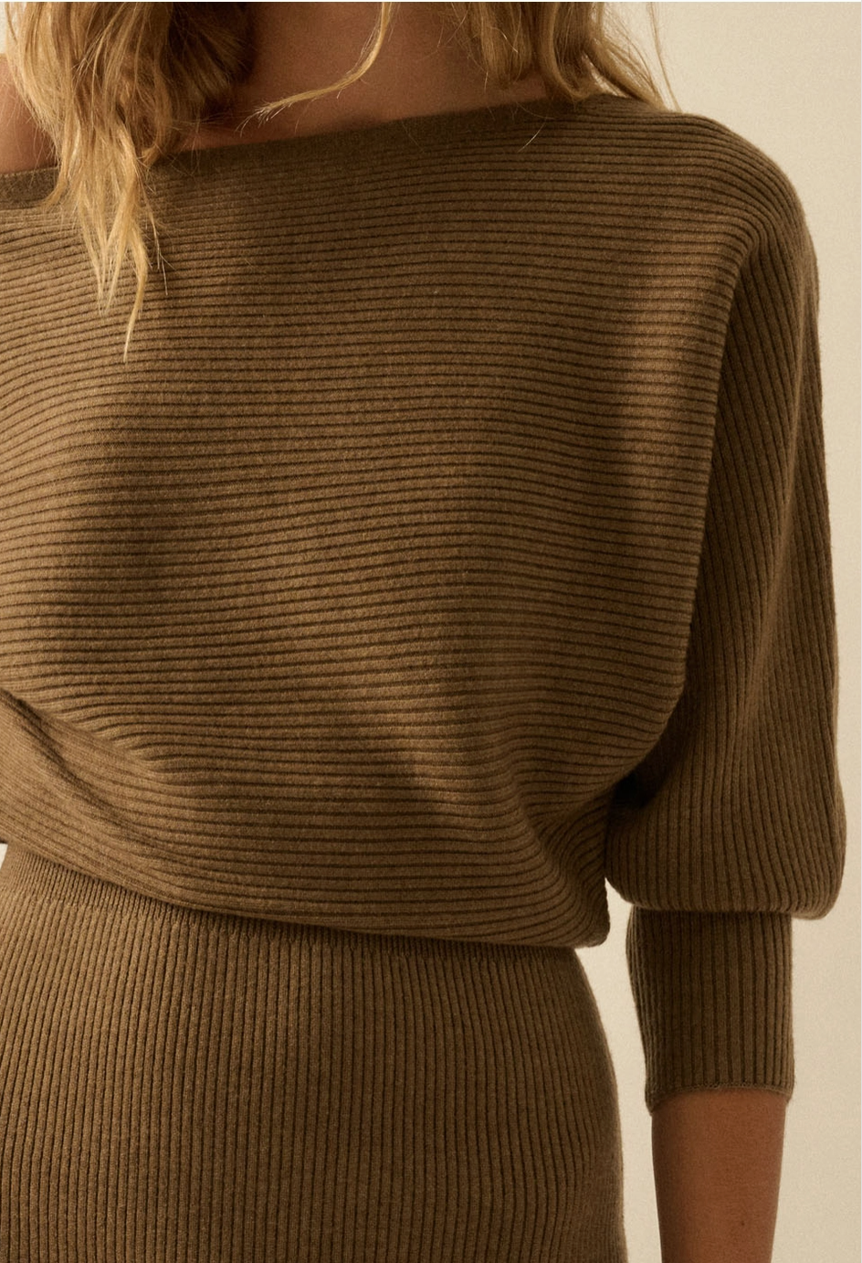 A ribbed knit sweater midi dress with the following features: One-shoulder boat neckline. Long dolman sleeves with wide cuffs. Side slit. Calf length. Relaxed fit.