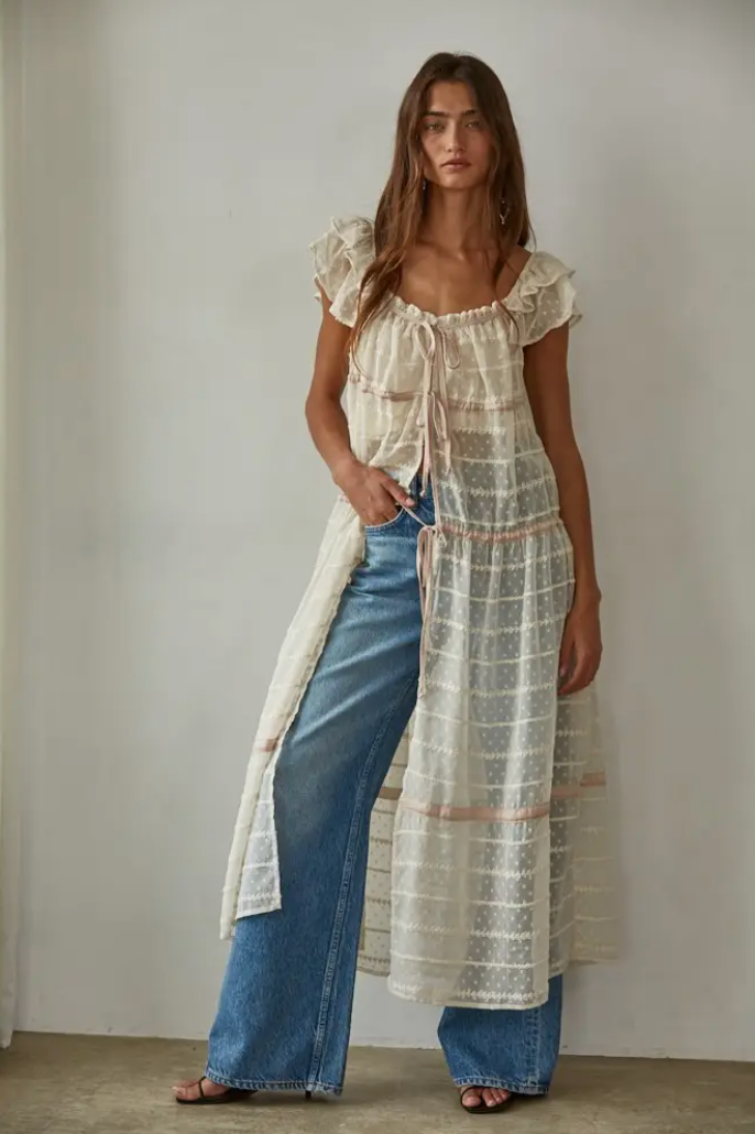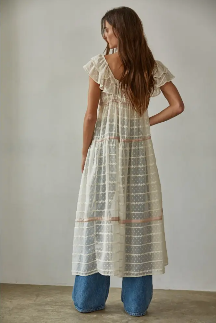 Woven Polyester / Chiffon Swiss Dots / Embroidered See Through / Open Front / Sweetheart Neck / Ruffled Short Sleeve / Flare Maxi Dress With Front Tie Straps (No Lining)